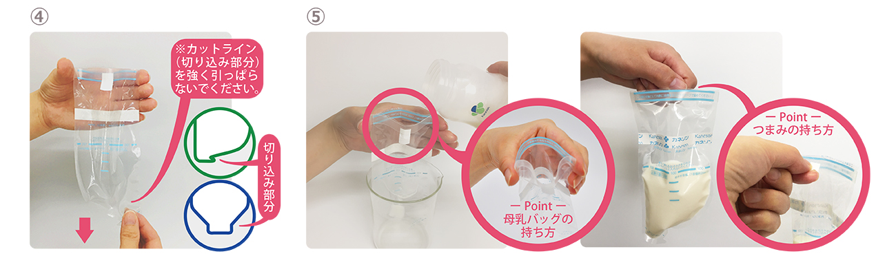 ●解凍した母乳を哺乳びんへうつすときは、母乳バッグ下端(25ml、150mlは下部中央)にある注ぎ口を上にして、切り込み部分をカットラインに沿って引き裂いて注いでください。