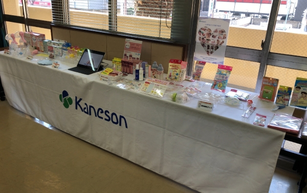 参加者のパパママたちは、保健師さんからの説明を聞いた後、2グループに分かれて交替で私たちのいるお部屋にお越しくださいました。こちらのお部屋では、保健師さんによる抱っこ・着替え・おむつ交換・哺乳瓶授乳の仕方の説明後、パパママが赤ちゃん人形で実践したり、パパは妊婦ジャケットの着用体験をしたり、カネソン商品を含む出産準備物の展示をご覧いただけます。