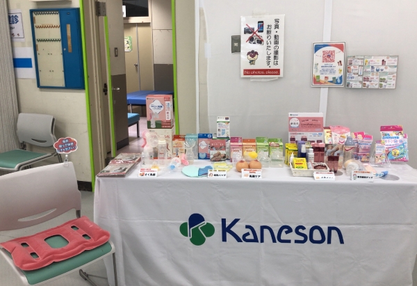 パパママたちは、はじめに赤ちゃん人形で沐浴体験をされました。その後、動画「赤ちゃんが泣き止まない(泣きへの対処と理解のために)」の鑑賞に引き続き、わたしたちカネソンからは「産前産後に役立つ育児グッズのご紹介」と題してスライドを使った説明をさせていただきました。